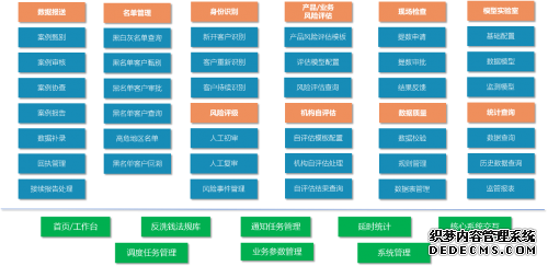 系统集成九大核心功能模块,覆盖相关工作主要场景与合规要求,具体包括:大额及特定交易报送、名单实时监控、客户身份识别与风险评级、产品(业务)风险评估、机构风险自评估、现场检查数据管理、统计分析报表、系统运行管理、案例甄别与处理。